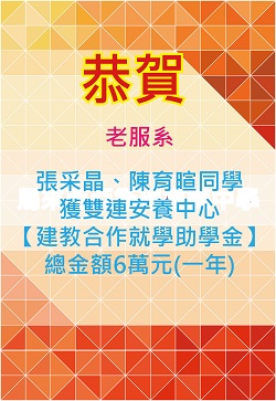 恭賀~老服系張采晶、陳育暄同學獲雙連安養中心【建教合作就學助學金】總金額6萬元(一年)。 (2019-11-01)